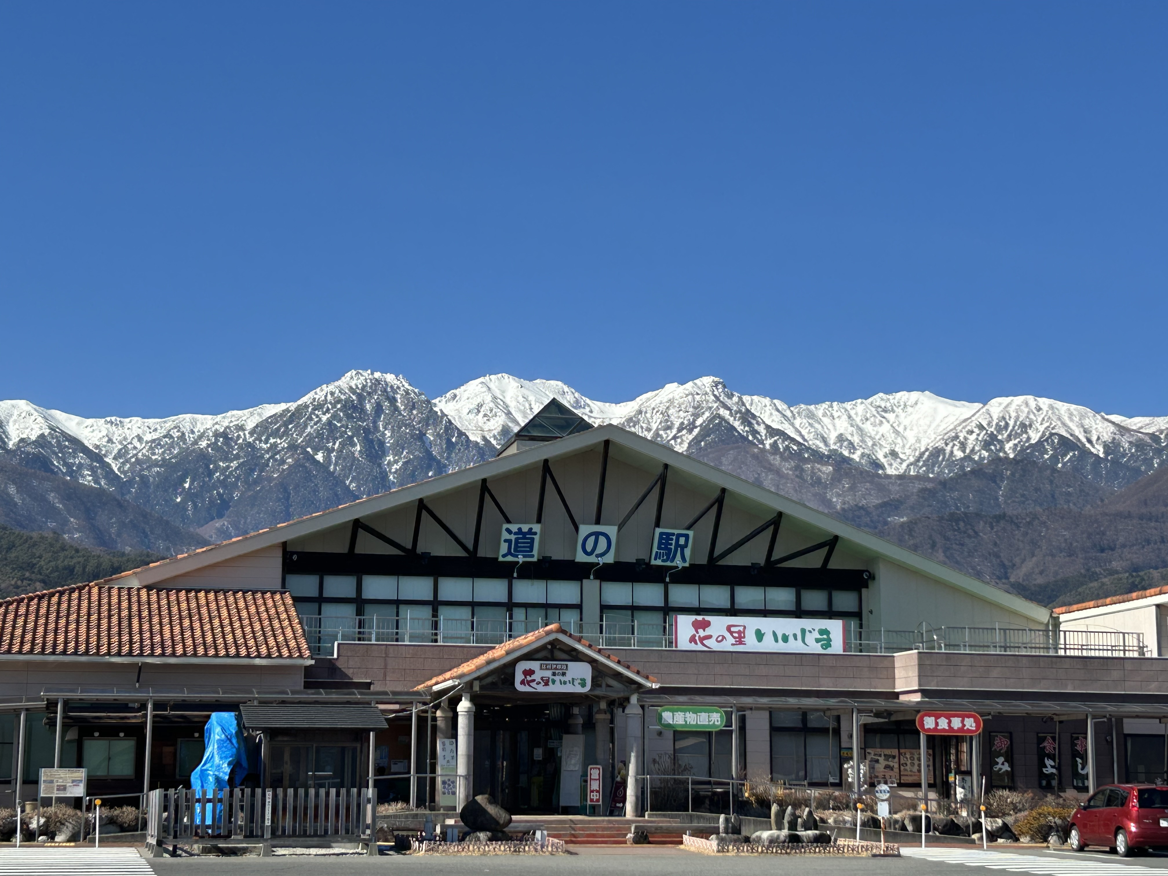 南アルプスの山並みをバックに写っておりますのが「道の駅いいじま」(長野県)。
