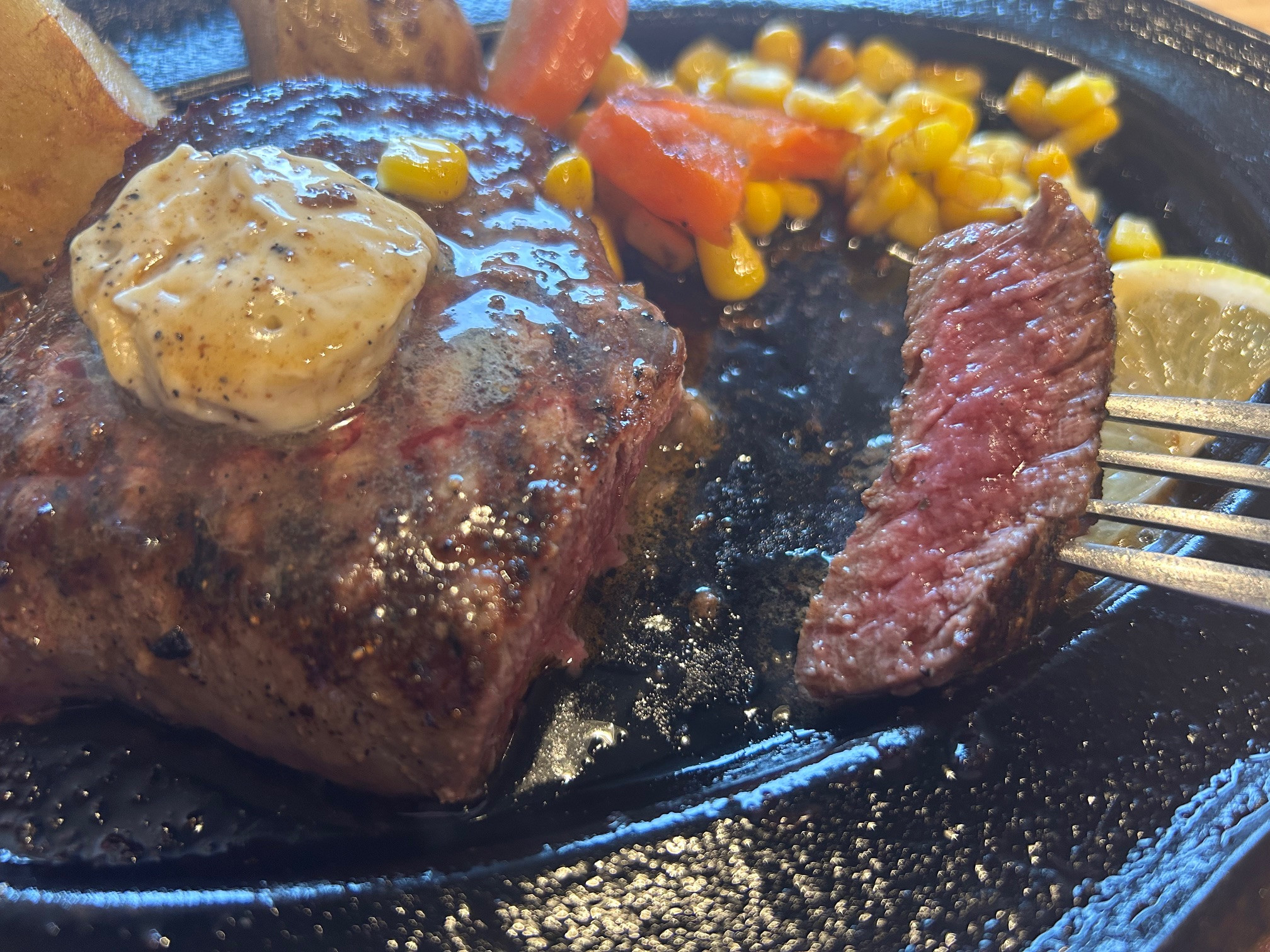 お昼ともなると、地元の方でにぎわうステーキハウス。見てください。外はこんがりですが、中はジューシーなミディアムレア。